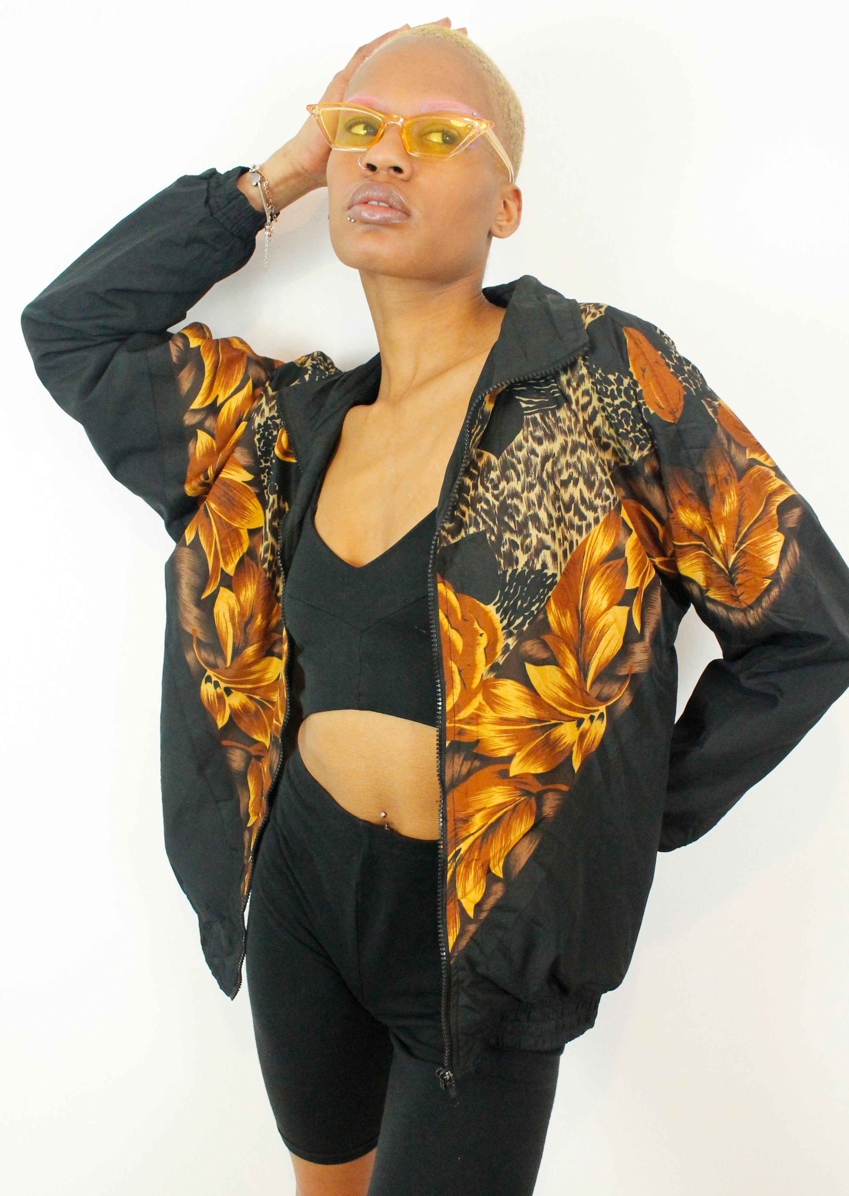 This awesome 90's light weight casual shell jacket features an abstract rose and leopard design, a zip fastening and 2 side pockets.Size small and measures flat armpit to armpit 24'', collar to hem 24'' and armpit to cuff 19''. This is the perfect light weight jacket for festival season!